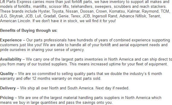We have great prices on all our forklift parts. For a price estimate on an attachment or part we offer, please call us at: